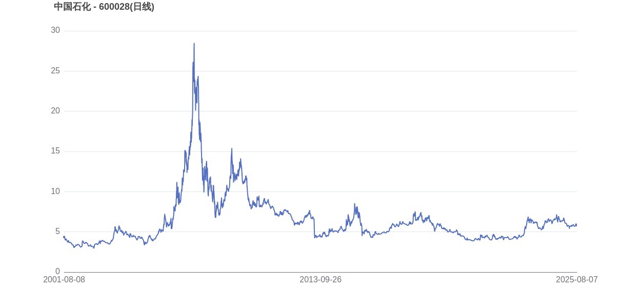 2007年11月05日,中国石化的市值巅峰达到25412.48亿元,股价也顺应升至29.31元。而至8月07日收盘,中国石化的股价为5.73元,市值为6947.35亿元,相比峰值时期市值减少18465.13亿元,市值蒸发了72.66%。