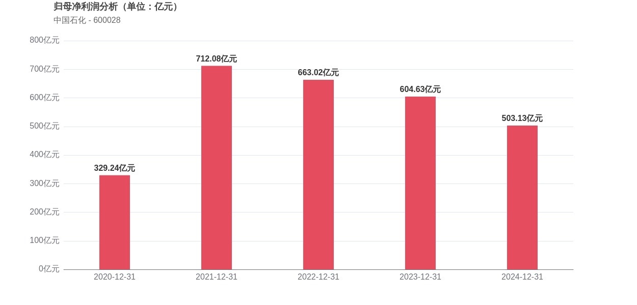 利润角度分析,2020年中国石化实现归母净利润329.24亿元,2024年503.13亿元。期间利润水平保持相对稳定并有所提升。